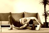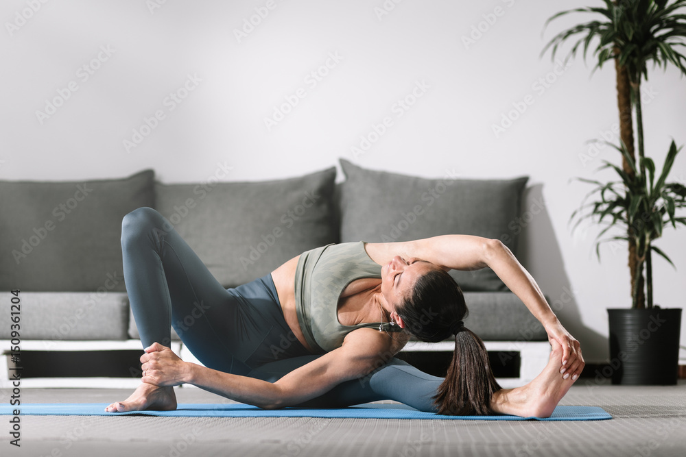 Yoga practitioner performs a flexible stretching pose in a modern indoor space with natural light and minimalistic decor