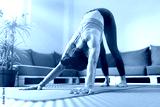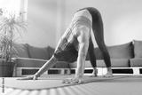 Woman practicing downward dog yoga pose in a cozy home setting during morning light