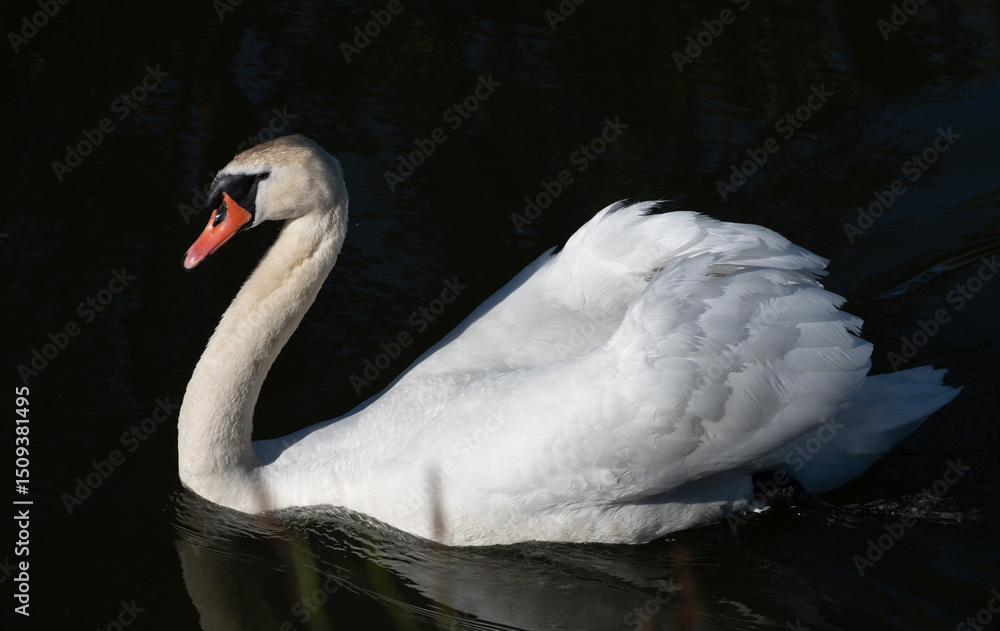A white mute swan swims over dark water. The wings are slightly raised. The swan shines in the sun.