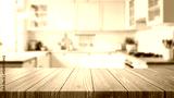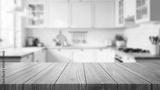 Empty wooden table placed in front of a kitchen with blurred light and modern wooden counter background. Minimal decoration, suitable for displaying food or decorating the house.