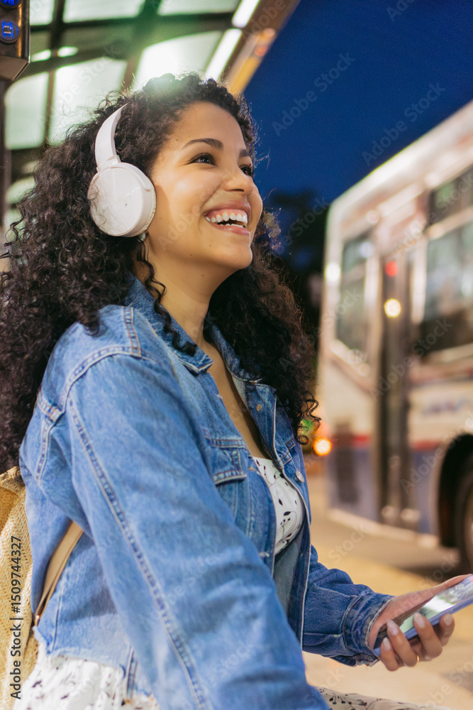 Independent young latin woman, smiling, listening music with headphones, waiting for the bus alone at night