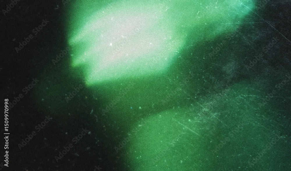 Vintage green abstract light leak overlay noise background with a dust and Scratches texture. Grunge style dusty overlay light leak background. Green light overlay, leak flare, light effect.