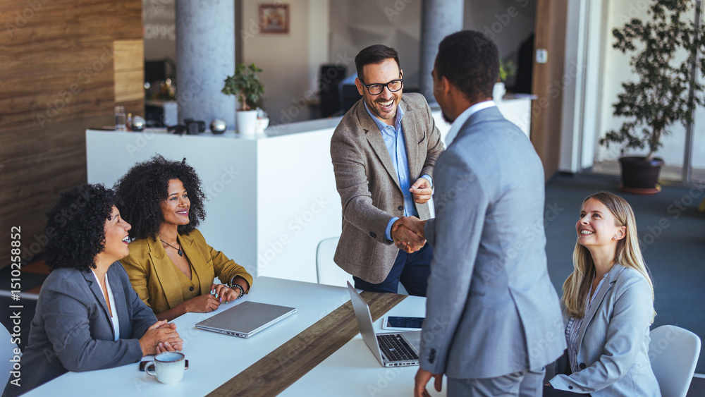 Colleagues Greeting New Team Member with Handshake in Modern Office