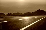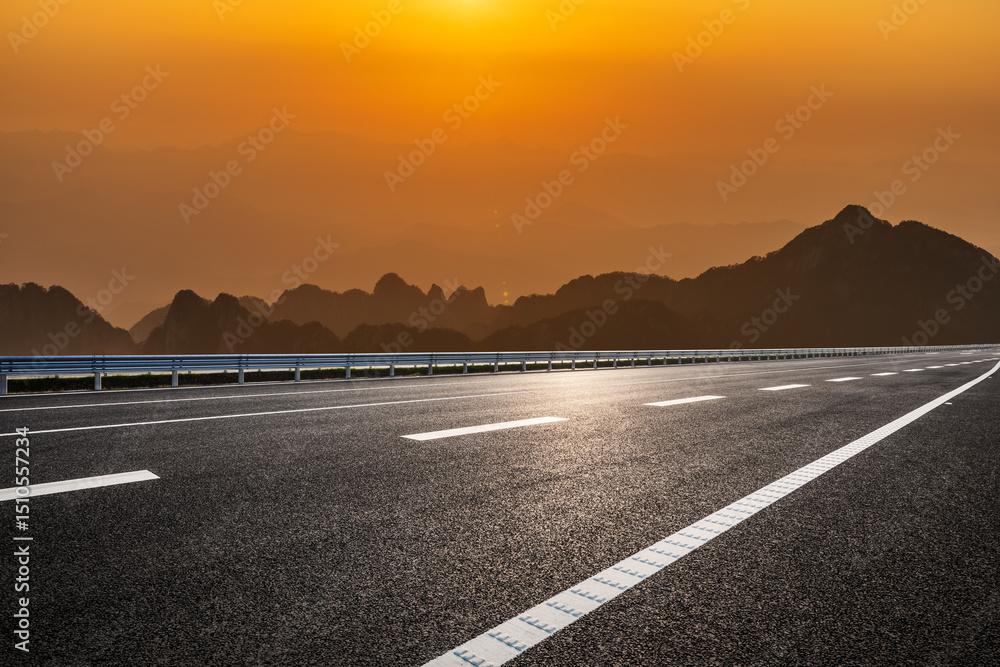 Empty asphalt highway road with majestic mountain silhouettes at orange sunset