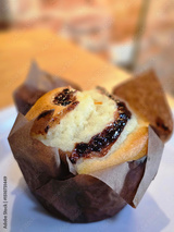 A close-up of a freshly baked muffin with chocolate swirls, wrapped in brown parchment paper, placed on a white plate in a warm, cozy cafe environment.