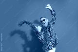 Cheerful Cheerful Stylish Senior Man in Colorful Outfit Gesturing Joyfully Against a Blue Background