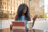 Young businesswoman using tablet and smartphone at outdoor cafe
