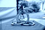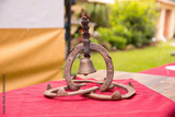 Rustic horseshoe bell centerpiece on red fabric at outdoor event