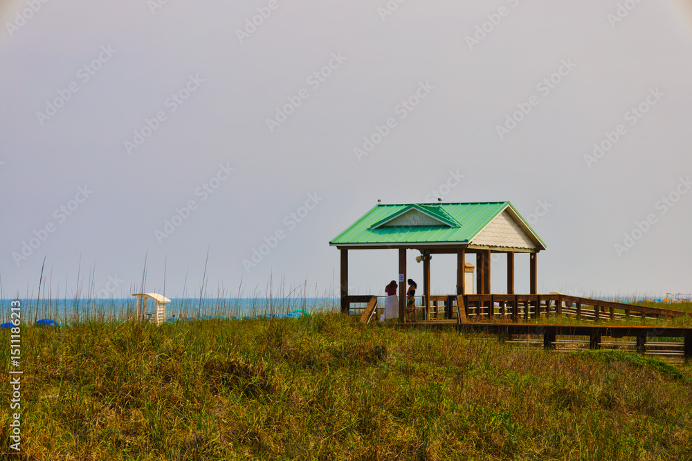 A view of a large gazebo surrounded by dune grass by the ocean at Carolina Beach in North Carolina USA.