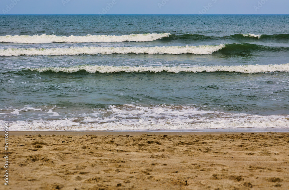 A nice closeup landscape in summer of a brown trampled sandy beach with bubbly emerald-green waves in the ocean at Carolina Beach in Wilmington, North Carolina in the U.S.