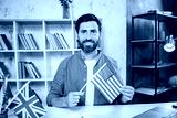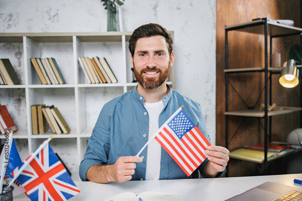 Bearded male tutor sitting at table holding flag of USA, looking at camera