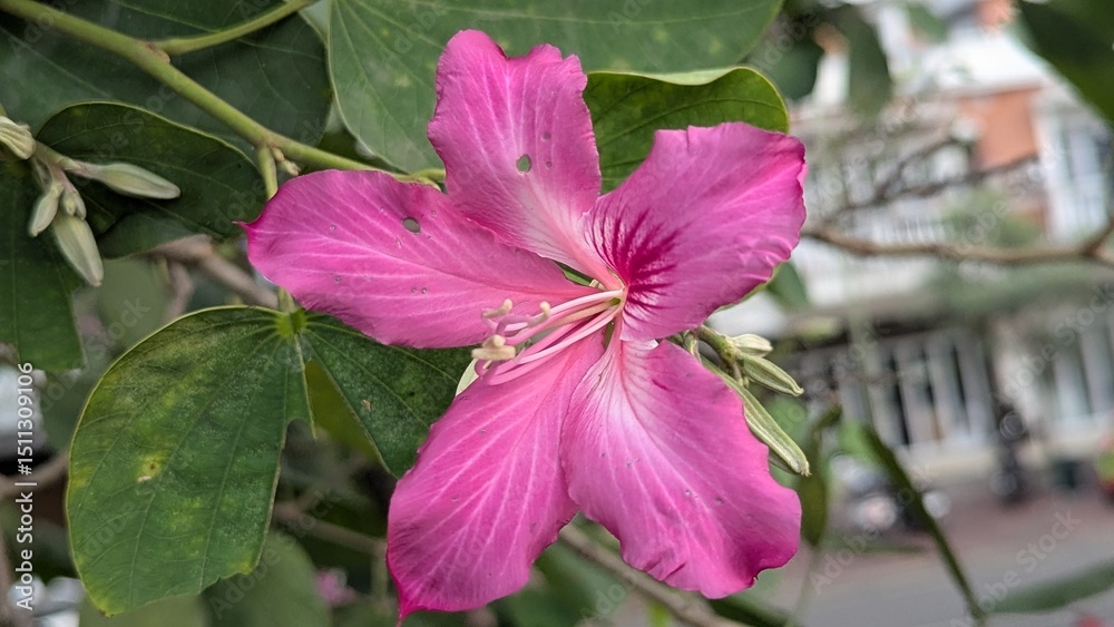 Close up Bright Hong Kong Orchid Tree Flower Blossom with Green Leaves in Garden
