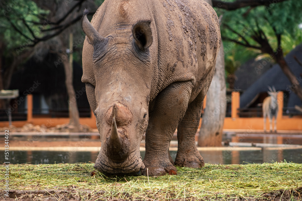 Wild african animals. Portrait of a male bull white Rhino grazing in Etosha National park, Namibia.