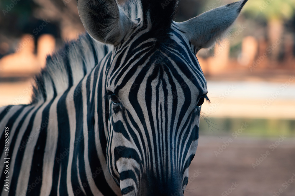 Close-up of a zebra's head with detailed black and white stripes. Ideal for wildlife, safari, nature, and monochrome-themed creative and commercial projects.