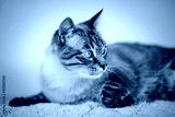 Thai purebred cat lies on a white carpet.