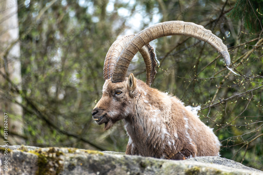 Male mountain ibex or capra ibex on a rock living in the European alps