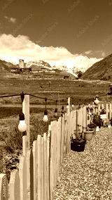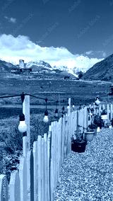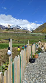 Svaneti, Mestia, Georgia - September 29, 2024: Scenic mountain view with colorful lights and wooden fence