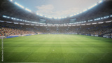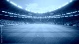 Daytime Elevated Shot Behind Soccer Goal in Stadium During Championship Match. Crowds of Fans Fill the Stands. Football Tournament, Cup Broadcast. Sport Channel Television Screen Content
