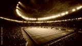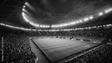 Night Drone Flight Around a Soccer Stadium. Aerial Views Capture the Pitch and Stands Filled With Thousands of Spectators. Arena Hosts a Major Sport Event