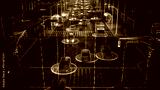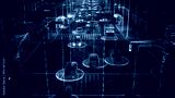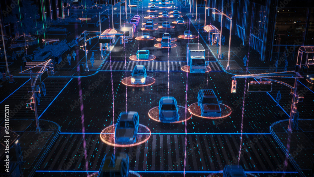 Futuristic City Intersection at With Cars on Glowing with Information. Neon Grid Lines and Digital Pathways Visualization of Data Transfer. Autonomous Cars Navigate the Complex Traffic System
