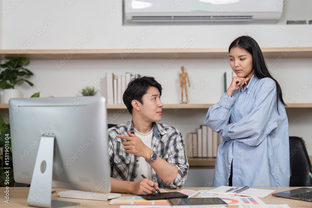 UX and UI Designers Collaborating. A focused discussion about design elements in a modern office.