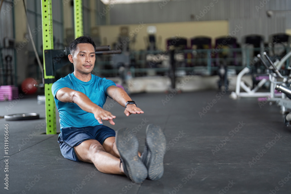 Fitness Focus. Man seated on gym floor, reaching out during a stretching exercise.