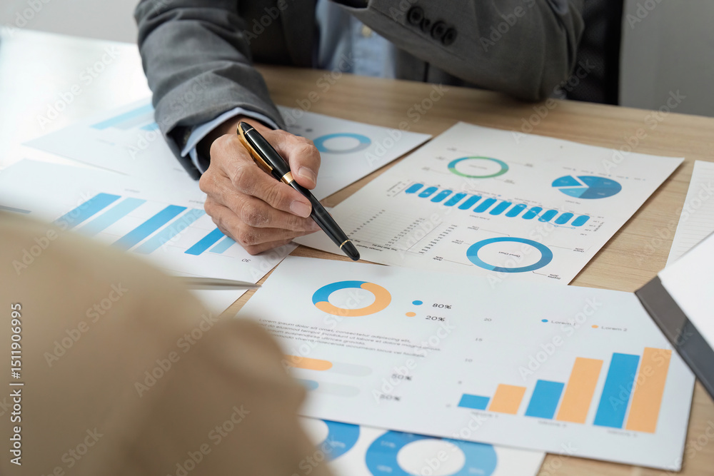 Business Analysis in Progress. A businessman pointing at financial data during a corporate meeting.
