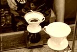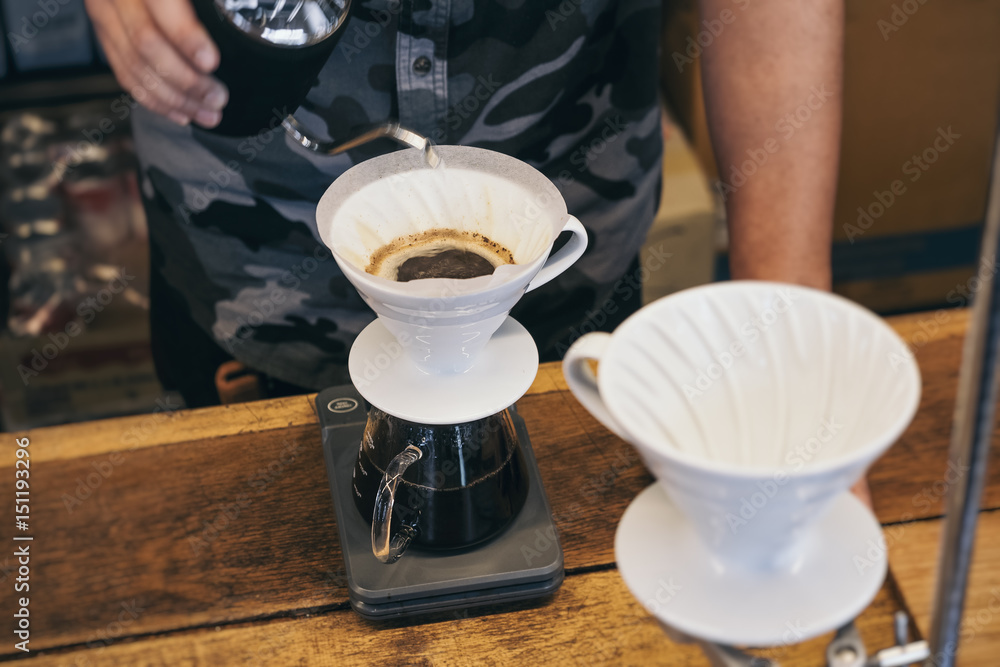 Hand drip coffee Barista pouring water on coffee ground with filter