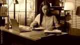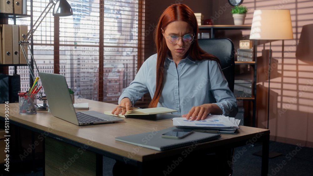 Stressed business woman businesswoman in office searching data throwing papers documents working laptop problem difficult Caucasian female girl paperwork overwork trouble employer writing managing