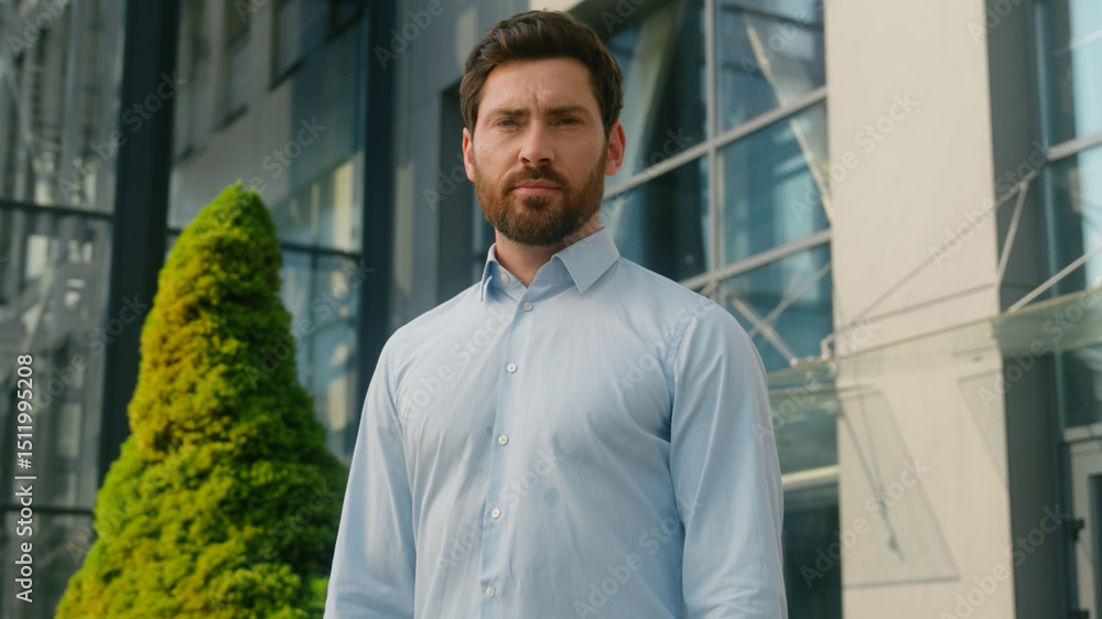 Business portrait man businessman guy male worker entrepreneur serious in city downtown looking at camera mature confident employer outside office pensive thinking professional posing near company