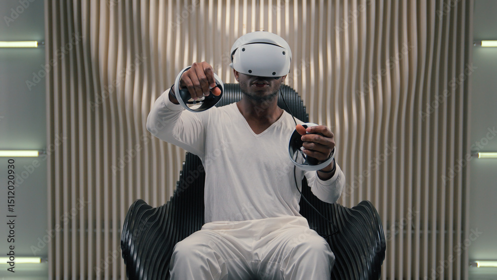 African American gamer guy male man wearing virtual reality headset indoors playing interactive game with motion controllers immersive digital experience modern technology futuristic entertainment