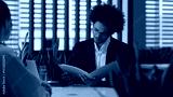 Two diversity business multiracial men businessmen in office talking papers documents research teamwork intern male guy interview hiring work African American boss reading resume insurance trading
