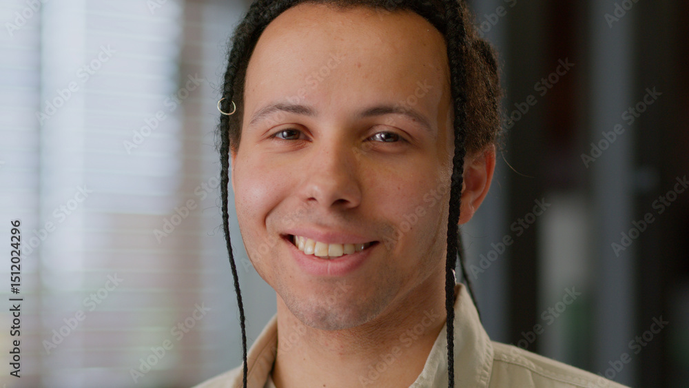 Close up headshot male ethnic businessman smiling face portrait business man American guy professional with dreadlocks braids looking at camera smile in office company working startup manager indoors
