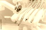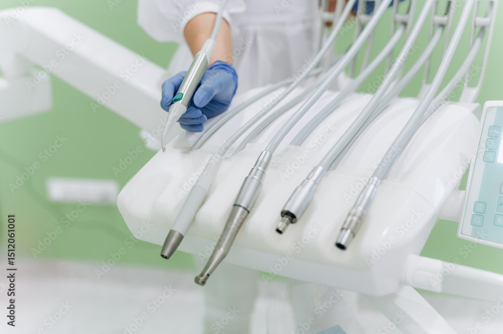 Dentist's hand holding dental tool on a unit console. Close-up in a modern clinic