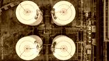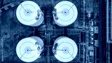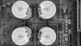 Aerial top view petrochemical plant oil refinery storage tank pipe line at night, Petroleum oil refinery industrial infrastructure oil storage tank, Oil refinery petrochemical industrial chemical.
