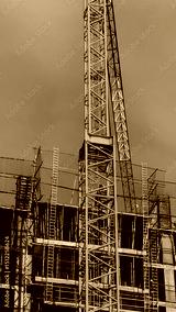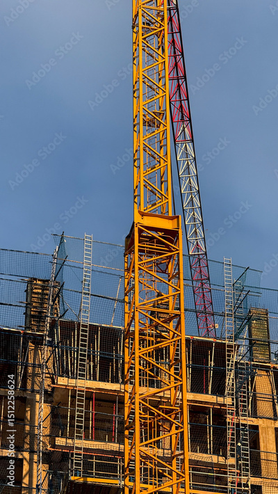 Golden crane ascends against steel lattice, embodying urban metamorphosis; build dreams, Construction Safety Week, towering ambition