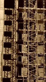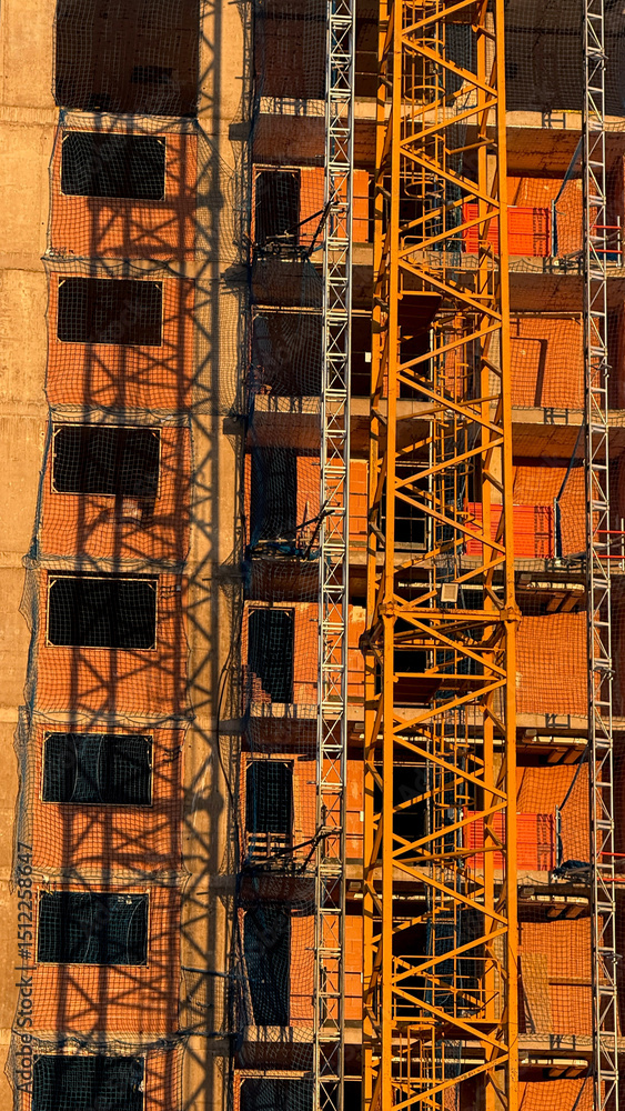 Golden crane casts intricate lattice shadows on a soaring urban construction, echoing the future's skeleton, International Workers' Day