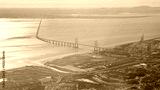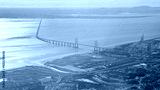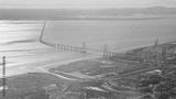 Expansive Lisbon bridge slicing through silver waters, symbolizing unity and transcendence, reminiscent of Midsummers Eve, connecting Nordic dreams