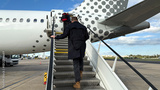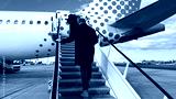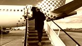 A tall Caucasian man boarding a speckled plane, whispers of wanderlust and World Tourism Day, under azure skies