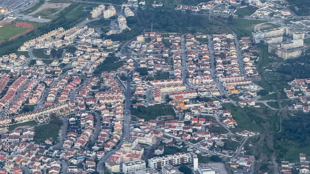 Aerial tapestry of labyrinthine urban terrain, capturing vibrant Portuguese cul-de-sacs, evokes World Urbanism Day and azulejo-nostalgia