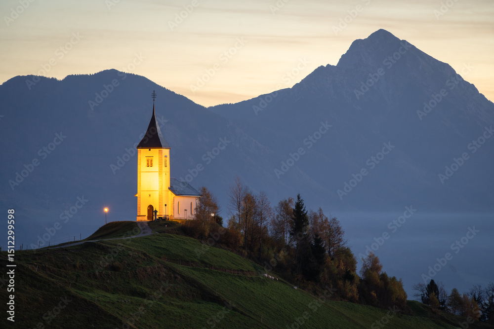 Small illuminated church on top of a hill with mountains in backdrop during sunrise, Slovenia, EU
