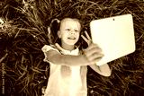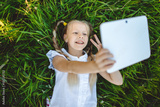 Little blonde girl taking selfie in yellow field