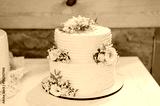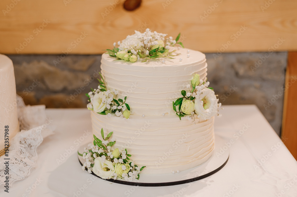 Rustic two-tier wedding cake adorned with delicate white flowers, green leaves, and frosting texture, displayed on a white table in stone interior.