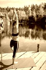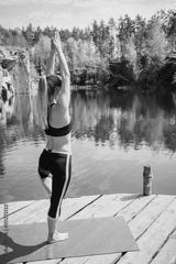 fitness, sport, training, outdoors and lifestyle concept - woman in tree pose near the water during bright summer day. Yoga everywhere