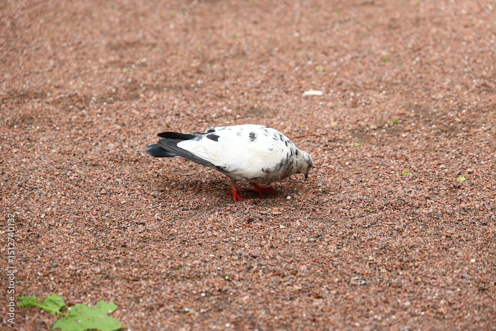 A pigeon is foraging diligently on sandy ground, set in a wonderfully tranquil setting
