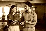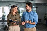 Professional business people having conversation sharing ideas. Female executive manager working together with male employee. Happy busy team partners using digital tablet talking standing in office.