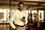 Young Black businessman entrepreneur using smartphone looking at camera with cell phone at work. Smiling busy professional African American business man standing in office holding mobile cellphone.
