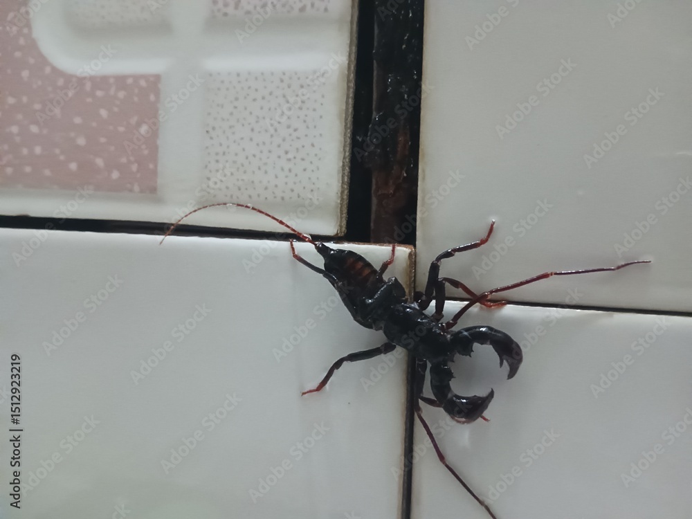 A black vinegaroon (whip scorpion) crawling on white bathroom tiles near a corner with visible grout lines and moisture.