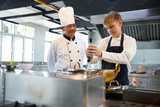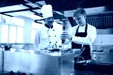 young chef cooking some food and senior chef beside him in the kitchen