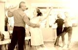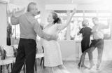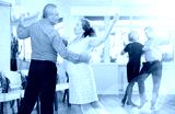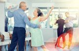 Happy mature woman enjoying impassioned merengue with male partner in latin dance class. Social dancing concept